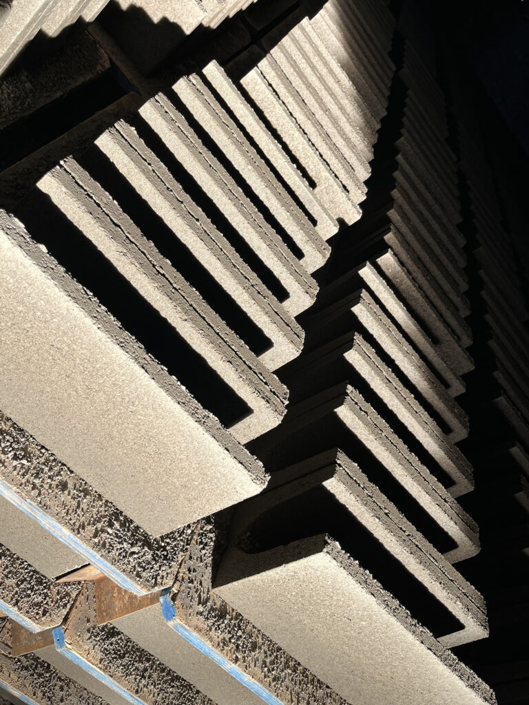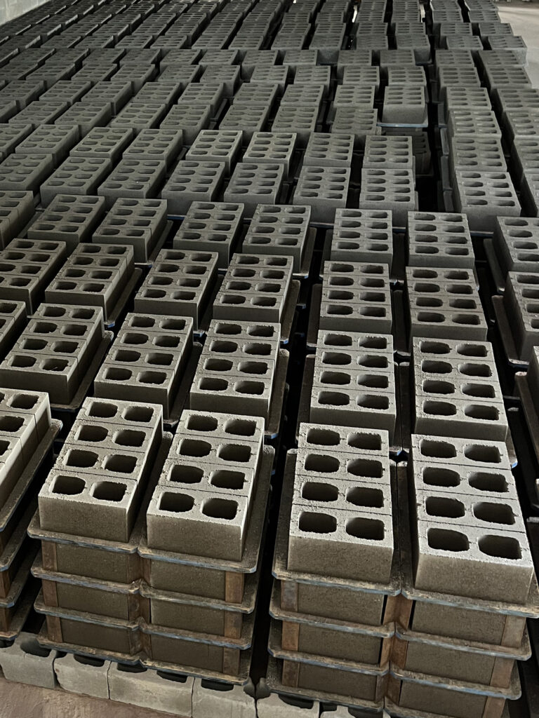 Após a vibro prensagem, as peças são imediatamente desmoldadas e cuidadosamente transportadas em paletes até a área de cura por até 72h. Esse processo, realizado em ambiente controlado de temperatura e umidade, garante o desenvolvimento da resistência mecânica e durabilidade dos produtos, assegurando a performance ideal para cada aplicação.